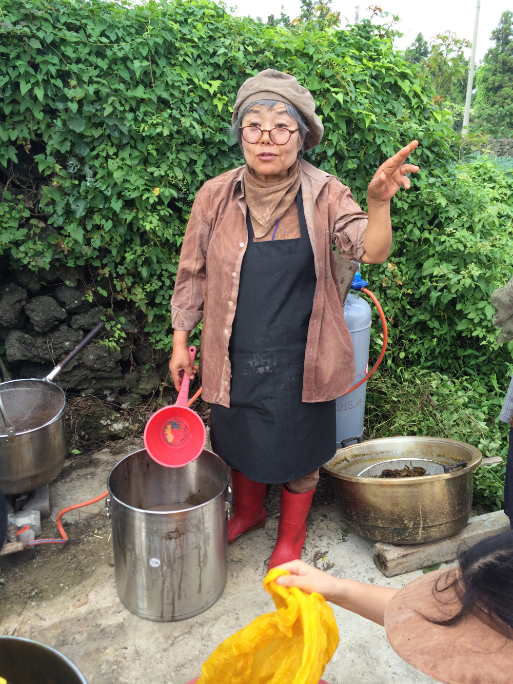 강연외에도 3가지 워크샵중에 한가지를 골라 배울 수 있는 기회가 있었답니다. 제주서 유명한 갈물 (감물 들이기)을 배울 절호의 기회! 갈물은 제주의 노동복에 사용된 것으로 풋감을 으깨어 즙을 내어 물을 들였답니다. 해충을 막아주고 물에 젖어도 몸에 달라 붙지 않고 또 옷감에 강도를 더해 오래 사용할 수 있게 해주었다지요. 워크샵에서 실크 스카프에 감물을, 실크 한마에 감물과 치자물을 함께 들였답니다. 감물은 물에 적셔 햇볕에 널면 점점 색깔이 진해집니다. 최고 10번까지 되풀이해서 짙은 색상을 얻을 수 있다네요. 전 집에 돌아와서 캘리포니아의 좋은 햇살아래 되풀이해서 진한 색상을 얻고 있답니다.
