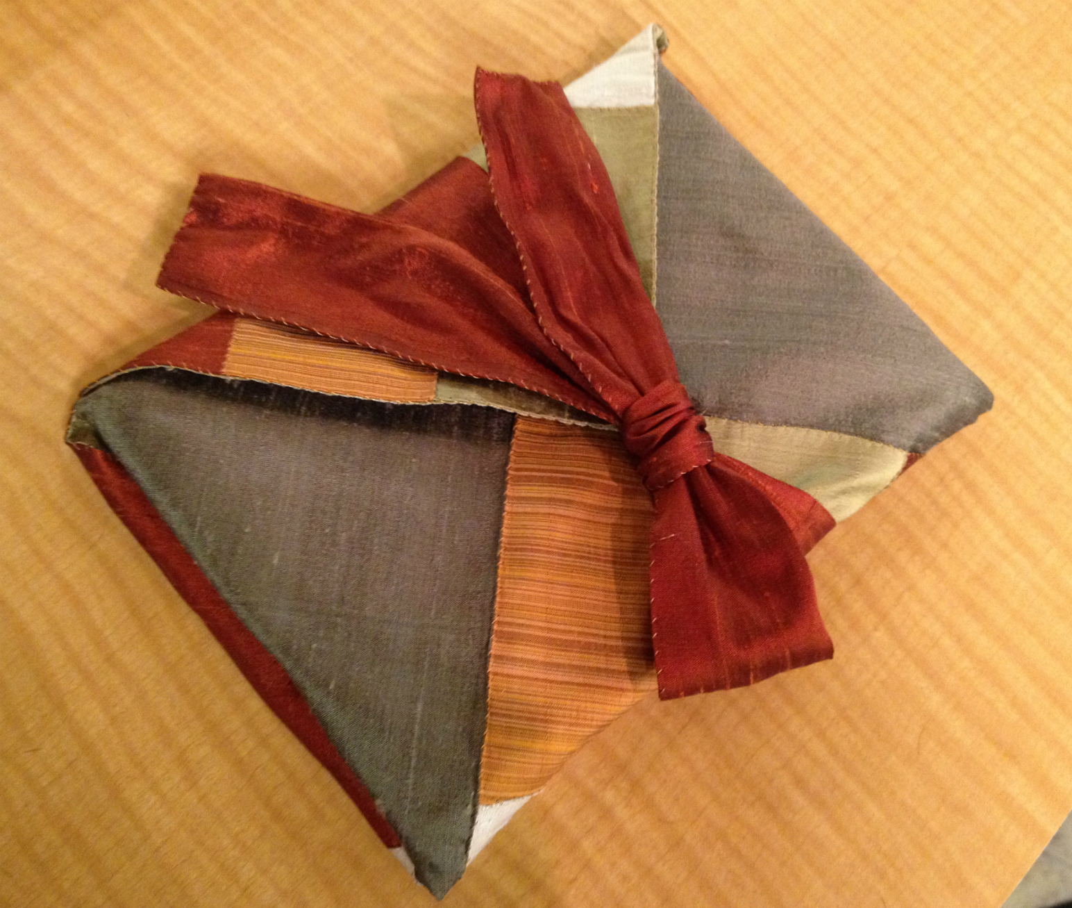 제 미용사, 샌드라는 바느질, 재봉틀 그리고 옷감 얘기가 나오면 저랑 끝없이 얘기를 할 수 있을 만큼 아는게 많은 사람입니다. 그런 샌드라에게 제 디비디를 선물하는 건 당연한 일이지요. 이번에 머리 손질을 하러 갔더니 깜짝 놀랄만한 걸 보여주네요. 친구 나오미에게 디비디를 빌려줬더니 보자기에 싸여서 돌아왔답니다! 디비디를 보고 아주 잘 만들었다는 평을 제게 꼭 전해달라면서요! 꼼꼼한 손바느질과 색상 선택까지 나무랄 데가 없네요.
