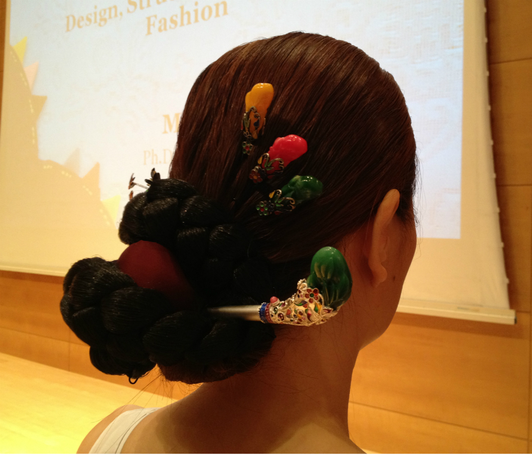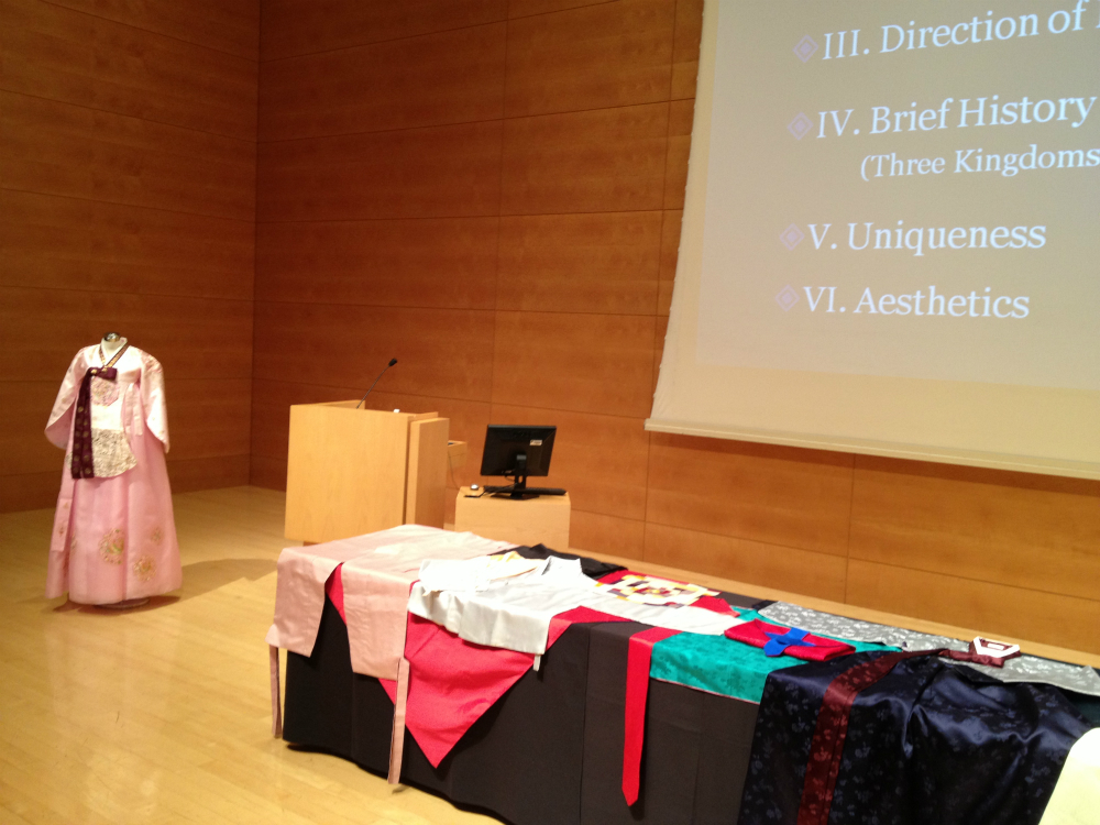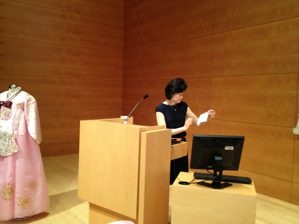 Frankly it was my third time listening same lecture since she did a couple of practice run but it was the best lecture out of those three! Despite it was a drop in lecture, more than 150 people came and listened her lecture. And some of them were waiting to ask questions after the talk is over. As you see below, she brought many different Hanbok (Korean costume) to show. And there was a volunteer model from Korean Cultural Center to demonstrate how to wear them. She wore Korean traditional hair style with beautiful hair ornaments. The curator of KCC also came and help out to make the lecture and the demonstration run smoothly.