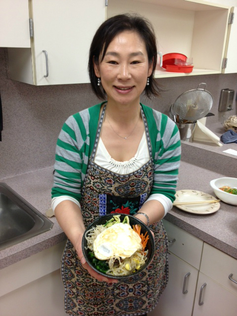 5 people came in with enthusiasm and soon we all started to make bibimbap, egg soup and stir fried fishcake. Korean cooking needs lot lots of prepping such as washing, cutting, blanching, mixing sauces and more washing (mixing bowls and other utensils). Everybody in my class were willing to cut many different vegetables, to cook everything separately (even though we mix everything right before we eat bibimbap!).