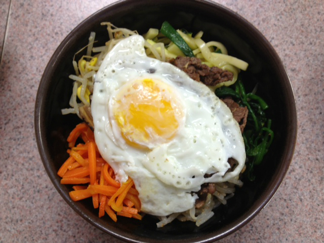 11. Put rice in the bowl and add all the vegetables and meat and put sunny side up egg in the middle.