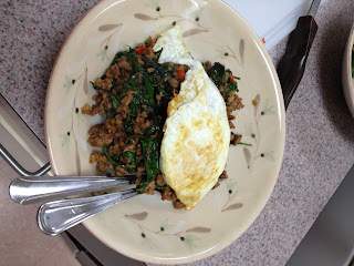 Tom Yum Goong is a sour soup with shrimp and Krapraw Mhoo is a pork with sweet basil dish.